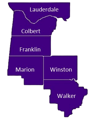 Colbert County, Florence City, Franklin County, Haleyville City, Jasper City, Lauderdale County, Marion County, Muscle Shoals City, Russellville City, Sheffield City, Tuscumbia City, Walker County, Winfield City and Winston County