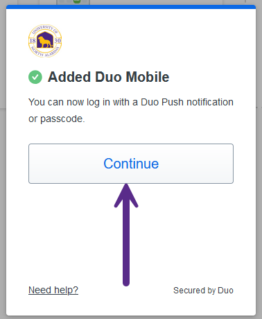Click the "Continue" button to finalize activating your new phone in the Duo Mobile app.