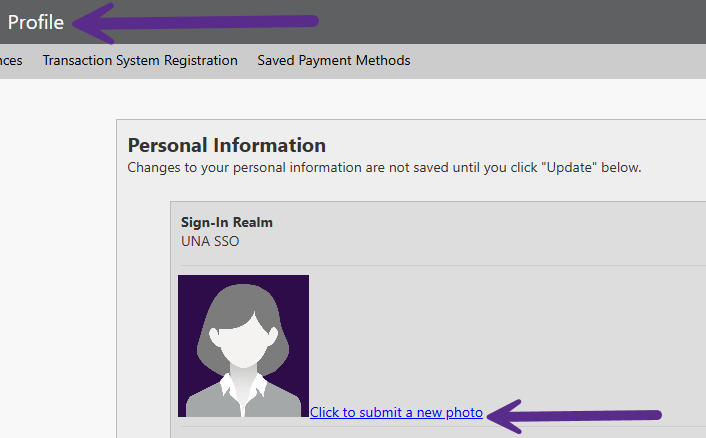 - If you haven't already done so, submit a photo and a picture of your current government-issued photo ID at https://eacct-una-sp.transactcampus.com/eaccounts. Once you log in, you will see a “Profile” option at the top left of the screen. On your profile page, you should see a blue hyperlink allowing you to submit your photo and the picture of your ID.